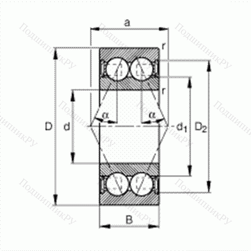 Основные размеры по DIN 628-3, двухрядные, контактные уплотнения с двух сторон, угол контакта α = 25°